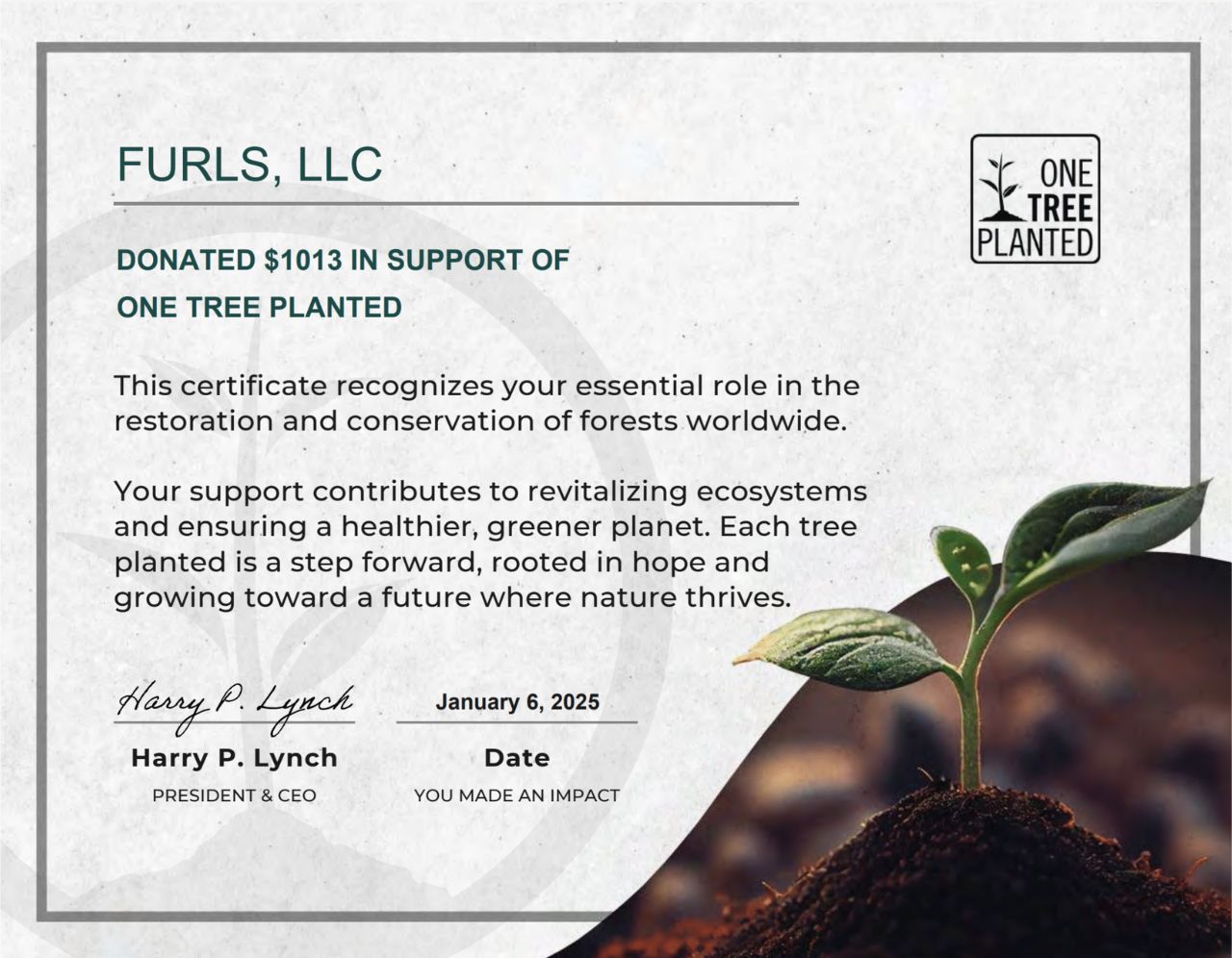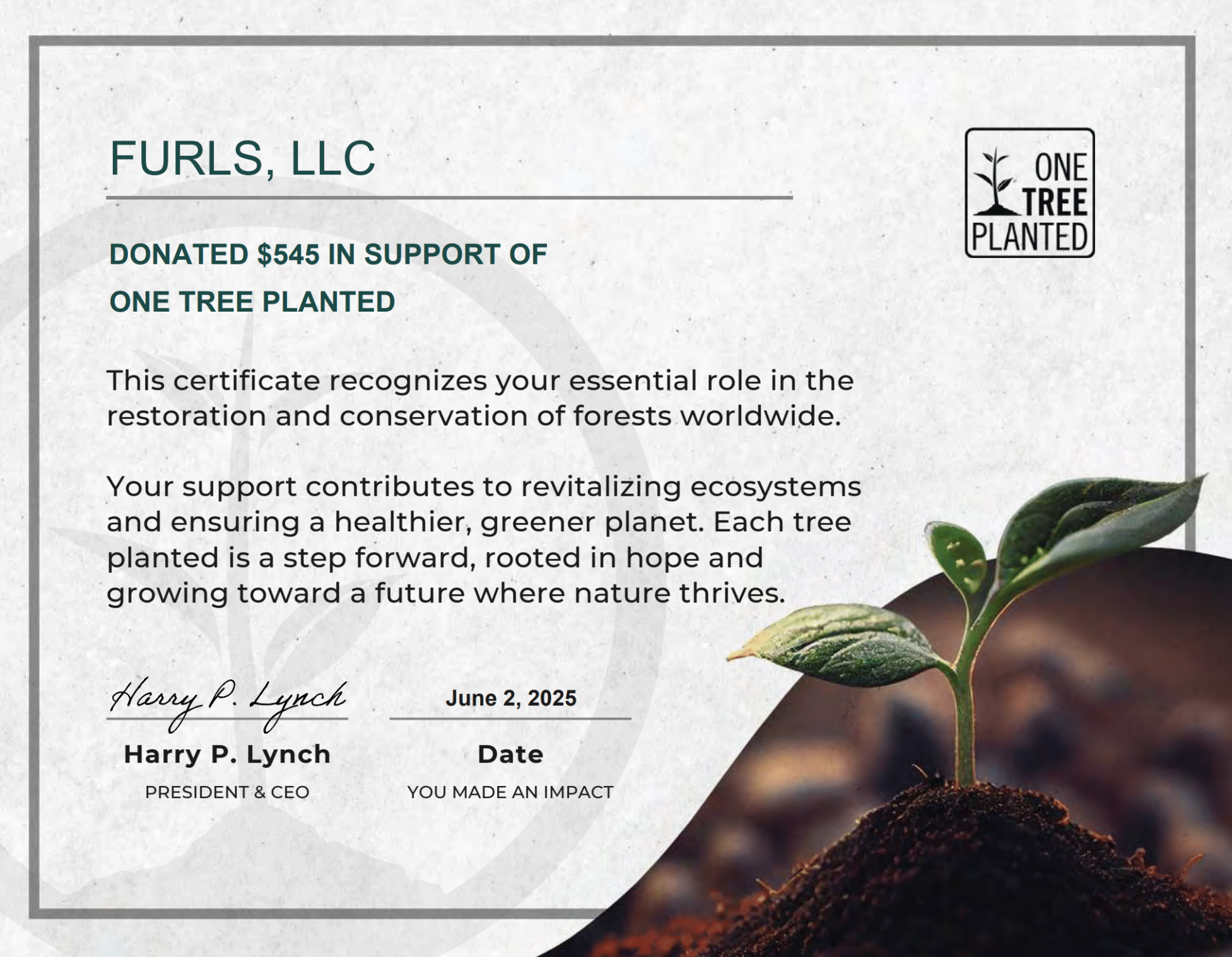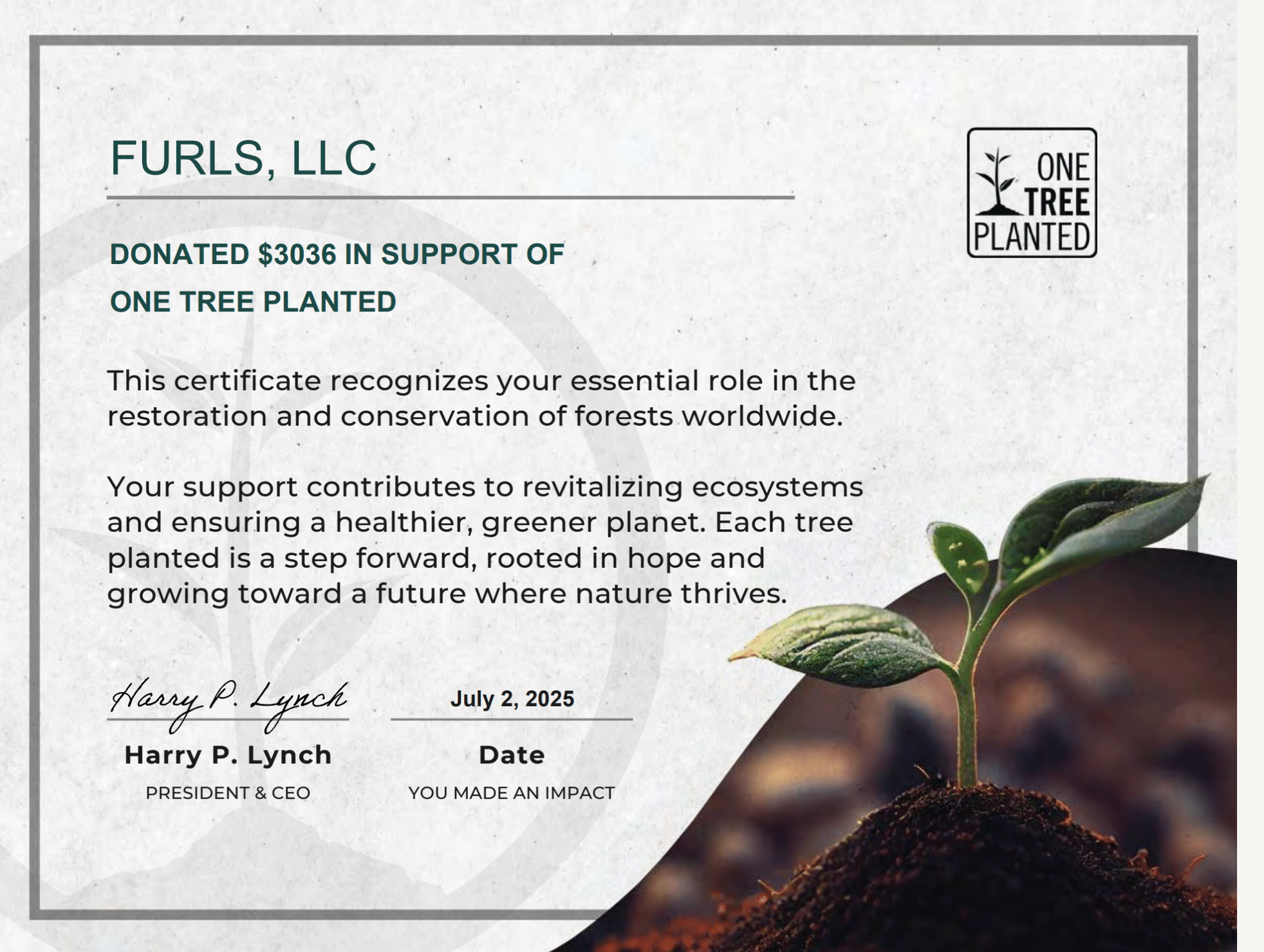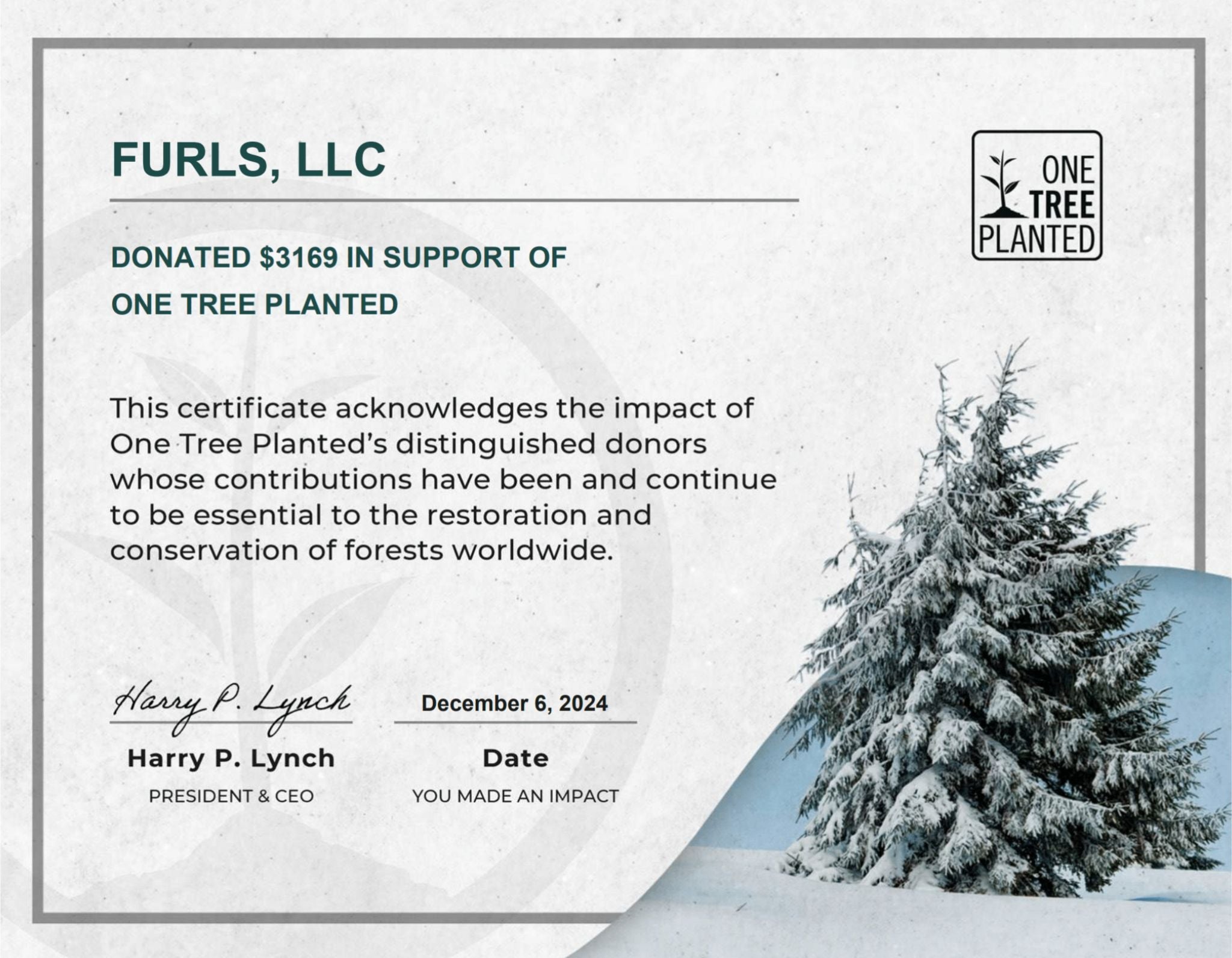 For transparency, Furls provides a record of the past 12 months of donation certificates, below.
